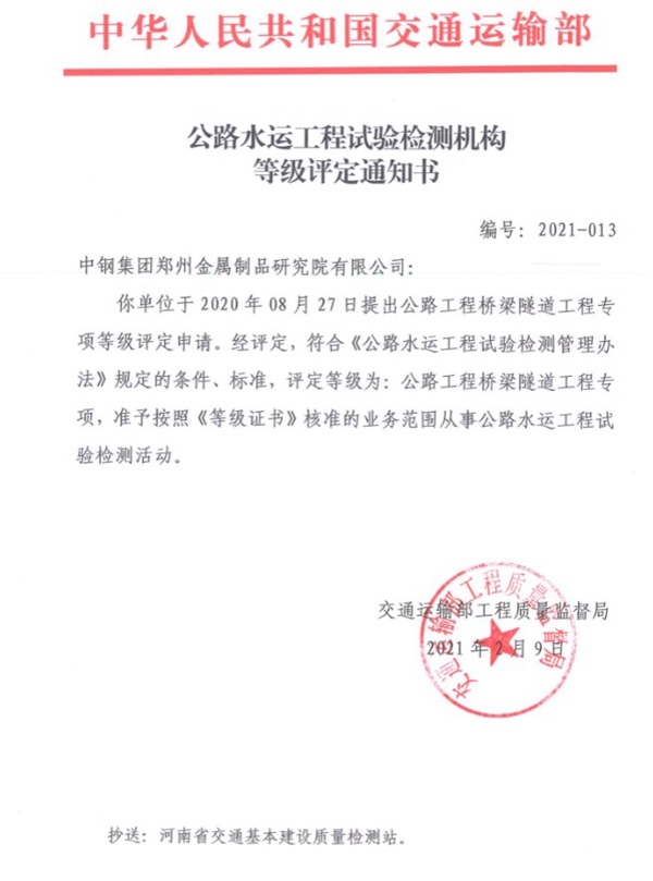 2021年2月9日,交通運輸部工程質量監(jiān)督局發(fā)布通知:經評定,中鋼集團鄭州金屬制品研究院有限公司符合《公路水運工程試驗檢測管理辦法》規(guī)定的條件、標準,評定等級為:公路工程橋梁隧道工程專項,準予按照《等級證書》核準的業(yè)務范圍從事公路水運工程試驗檢測活動。