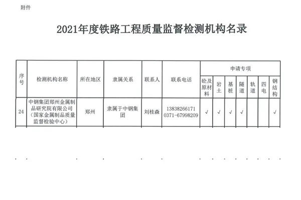 近日,鐵路集團(tuán)有限公司工程質(zhì)量監(jiān)督管理局發(fā)布了《關(guān)于公布2021年度鐵路工程質(zhì)量監(jiān)督檢測(cè)機(jī)構(gòu)名錄的通知》,并將滿足合格條件的91家監(jiān)督檢測(cè)機(jī)構(gòu)進(jìn)行公示,中鋼集團(tuán)鄭州金屬制品研究院(金屬制品質(zhì)量監(jiān)督檢驗(yàn)中心)再次上榜入圍,這標(biāo)志著中鋼國檢的工程檢測(cè)能力得到了高度認(rèn)可。